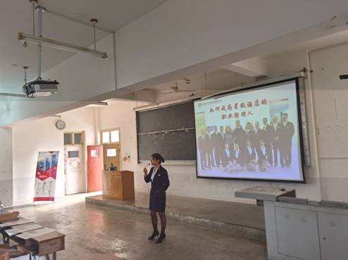 随後,襄陽民發瑞際酒店人力資源部總監焦麗與同學們就“如何成為優秀的酒店職業經理人”進行交流。焦麗總監不僅介紹了襄陽目前最奢華的酒店——民發瑞際酒店的情況,更是講解了高星級酒店對員工的行為素質要求,告訴同學們在工作中要有服從意識、敢于挑戰、積極進取等良好品德。