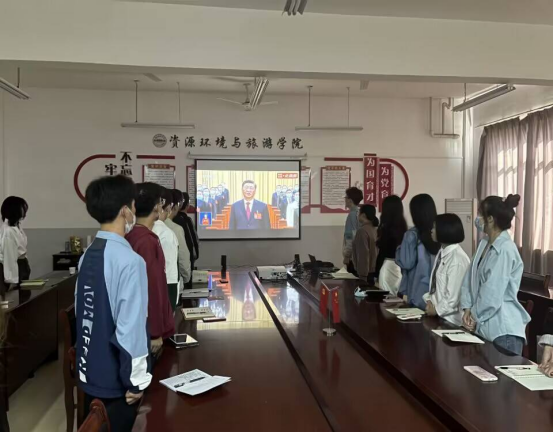 上午十點,大會準時召開,由國務院總理李克強主持開幕,參與觀看直播的同學與大會同步,全體起立奏唱國歌、默哀緻敬。緊接着聆聽習近平同志代表中共中央十九屆委員會所作的主題為“高舉中國特色社會主義偉大旗幟,全面貫徹習近平新時代中國特色社會主義思想,弘揚偉大建黨精神,自信自強、守正創新,踔厲奮發、勇毅前行,為全面建設社會主義現代化國家、全面推進中華民族偉大複興而團結奮鬥“的工作報告。