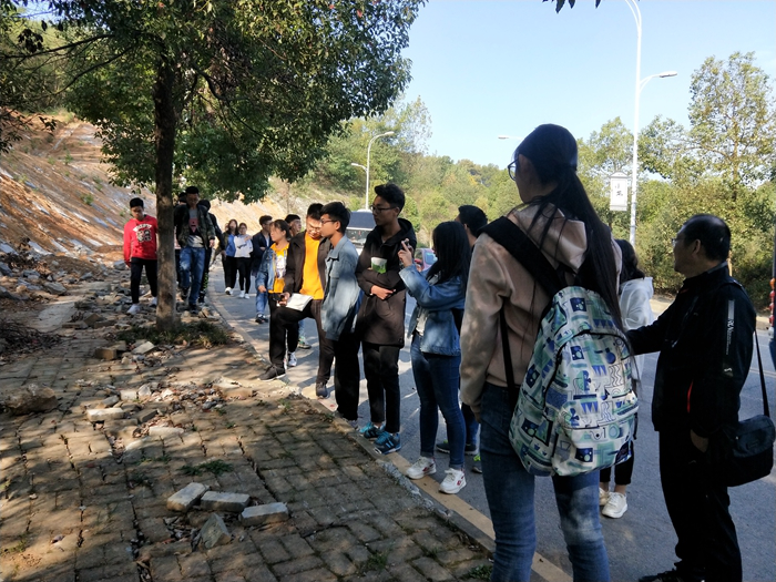張忠旺實地講解地質災害類型 蘇傳芳攝 早上7:50分,全班同學集合完畢,在張忠旺的帶領下前往大學路地質考察點,開展野外實地教學活動。同學們沿大學路前進,共走訪沿途七個災害點,由于部分災害點場地正在施工修複,同學們在張忠旺的指導下,觀察學習了災害的施工類型和治理情況。 同學們積極提問,張忠旺耐心講解,指導大家從觀察土層、測量傾角、地質災害點的實際情況出發,對各地質災害點的情況進行分組分析。 此次實踐教學,讓同學們對《水土保持學》有了一個更直觀的理解,鞏固了基礎知識,鍛煉了理論的運用技能。