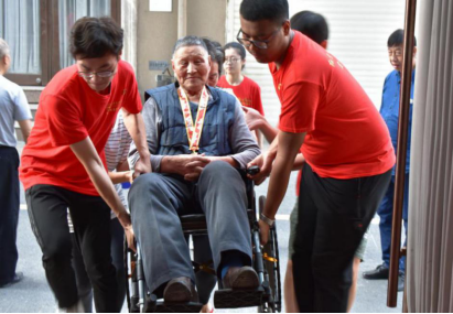 彙演開始前一個多小時,志願者們就來到襄陽市漢江國際老年公寓,幫助做一些力所能及的工作,與老人們談心。特别是幫助行動不便的老人們上下進出電梯,把很多坐輪椅的老人一個一個從有七八個台階的門口擡進演出會議室。