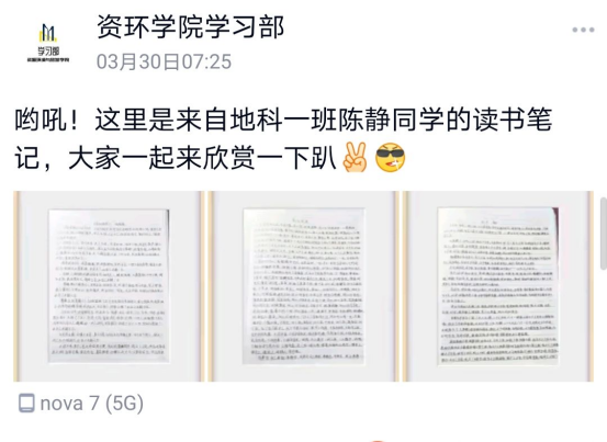 活動伊始,各班級根據每周的讀書筆記批改情況,各選出了三位優秀讀書筆記獲獎同學,他們分别是地科一班的陳靜、馮欣雨、餘杭,地科二班的馬天翼、朝兆萱、李思佳,旅管班的龍瑩、陳婵娟、高琳潔,學習部為他們頒發榮譽證書,并收取了他們的讀書筆記照片。後期每天由學習部官Q發表動态,對他們的優秀讀書筆記進行表揚。