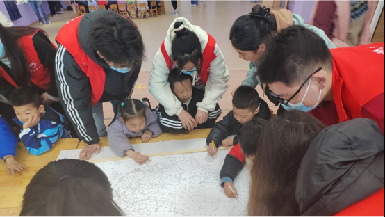 到達幼兒園後,園長熱情地帶領志願者們參觀幼兒園,然後引導小朋友們參與這節有趣的地理課堂。随着主持人介紹完活動流程後,志願者把小朋友們分成兩組,分别進行《五彩中國》地圖塗色活動和地球自轉和公轉小遊戲。小朋友們對志願者們帶來的地圖和地球儀有着強烈的好奇心和求知欲,在活動中踴躍回答志願者們提出的問題,同時志願者們也舉出生活中的例子加深他們對地球自轉和公轉的理解。知識并不隻在書本上獲得,也可以在生活實踐中不斷學習。