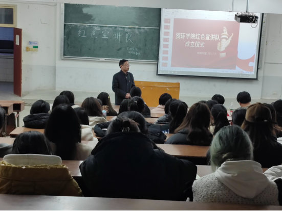(3044澳门永利集团欢迎您 通訊員 鐘熠琳)為積極引導青年大學生講好紅色故事,學習紅色精神,堅定不移聽黨話、跟黨走,厚植家國情懷,擔當強國使命,資環學院依托旅遊學社成立紅色宣講隊。3月23日晚,旅遊學社于北區4棟三樓JT-03教室舉行資環學院紅色宣講隊成立儀式,資環學院黨委副書記魯宏圖參加此次活動。