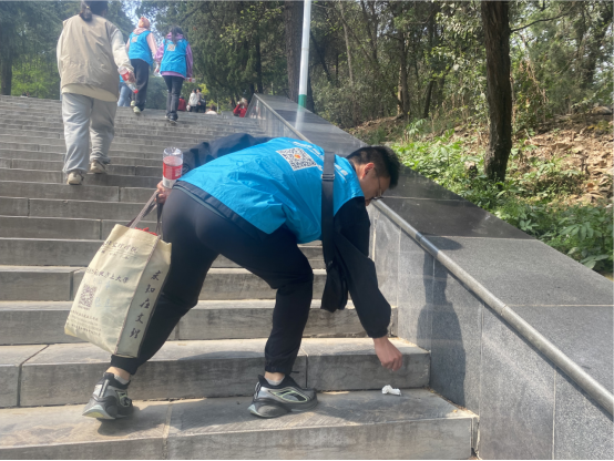 活動伊始,同學們在岘山文化廣場集合,負責人袁佳慧為志願者們發放馬甲,并組織志願者們在烈士塔下集合拍照。接着,志願者們在袁佳慧的帶領下攀登烈士塔,并沿途清理衛生。活動中,志願者們積極行動,他們身穿藍馬甲,細心拾起階梯上的垃圾,對這片區域的垃圾袋、紙屑、煙頭等進行清理打掃。志願者們充分發揚不怕髒、不怕苦、不怕累的奮鬥精神,大處着眼,小處着手,分工合作,默契配合,使烈士塔下階梯面貌煥然一新。最後,在活動負責人袁佳慧的組織下志願者們集合拍照。至此,本次活動圓滿結束。