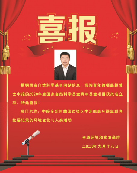 9月18日,根據國家自然科學基金網站信息,我院青年教師郭超博士申報的2020年度國家自然科學基金青年基金項目(項目名稱:中晚全新世季風邊緣區中北部高分辨率湖泊紋層記錄的環境變化與人類活動)獲批準立項,特此恭賀!