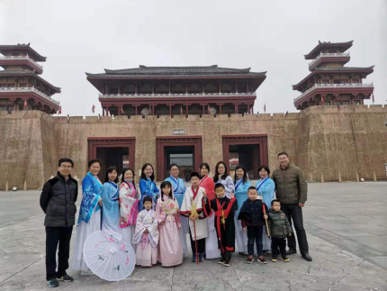 位于棗陽市的中國漢城景區,是以影視拍攝服務為主,兼具娛樂休閑、旅遊觀光等功能的綜合性旅遊區,2018年,中國漢城被湖北省教育廳授予“中國漢文化研學旅行基地”。在這裡,資環學院的女教師們穿着漢服,感悟漢史,朱運海博士給大家講解了我國服飾制度的演變及其深遠的文化内涵,老師們還對漢城景區研學活動的宣傳、運營等情況進行了調研。